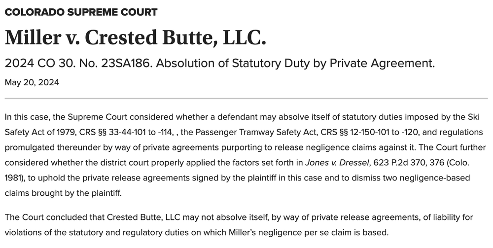 The Miller v. Crested Butte case loosened immunity protections for ski resorts in the case of negligence.