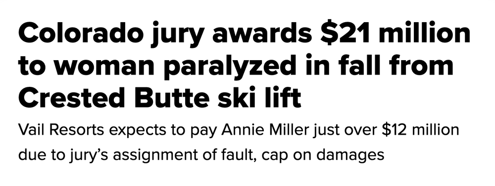 This all being said, Colorado law did impose a dose of reality on the $21 million award. State statutes cap noneconomic damages in ski cases at $690,000, far below what the jury granted for pain and suffering. Additionally, the jury assigned 25% of the fault to the Miller family—essentially concluding that by signing the waiver (and perhaps by Annie’s initial trouble loading the lift), the family bore some responsibility. We’re not going to dissect the logic of how the jury arrived at that percentage, but as a result, Miller’s recoverable compensation came out to $12.4 million. While far less than $21 million, this is still a historic sum in a ski lift injury case. It’s believed to be the first and only jury verdict against a ski resort based on failing to meet lift safety standards, marking a crack in the long-standing armor of liability waivers.